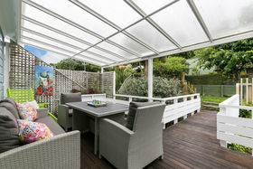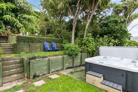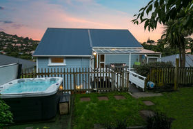 - Glazed west-facing deck that steps out to private, sheltered, terraced garden with kowhai and flowering cherry trees, flat lawn for kids to play, a big shed and Wendy house, and a spa pool